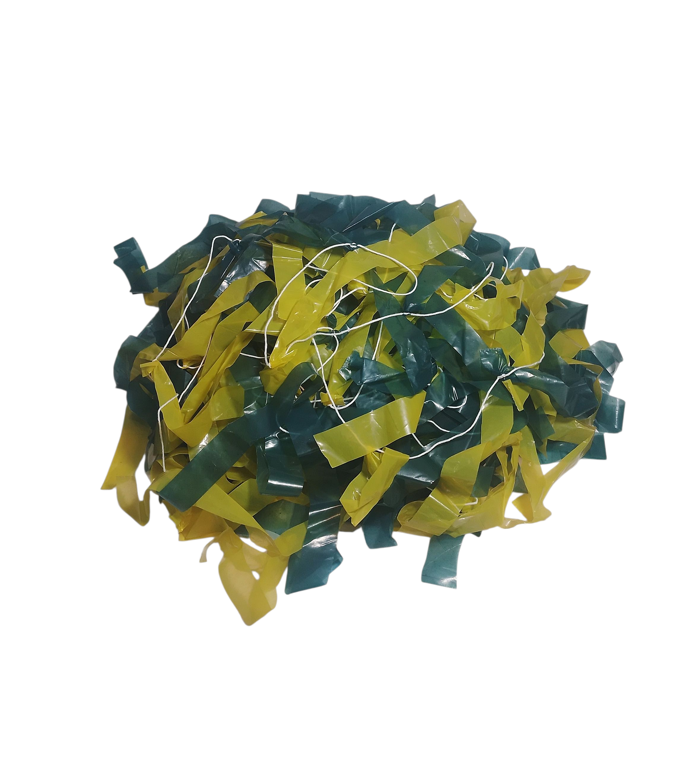 sendo 500 fitas amarradas no barbante 250 de cada cor totalizando 50 metros